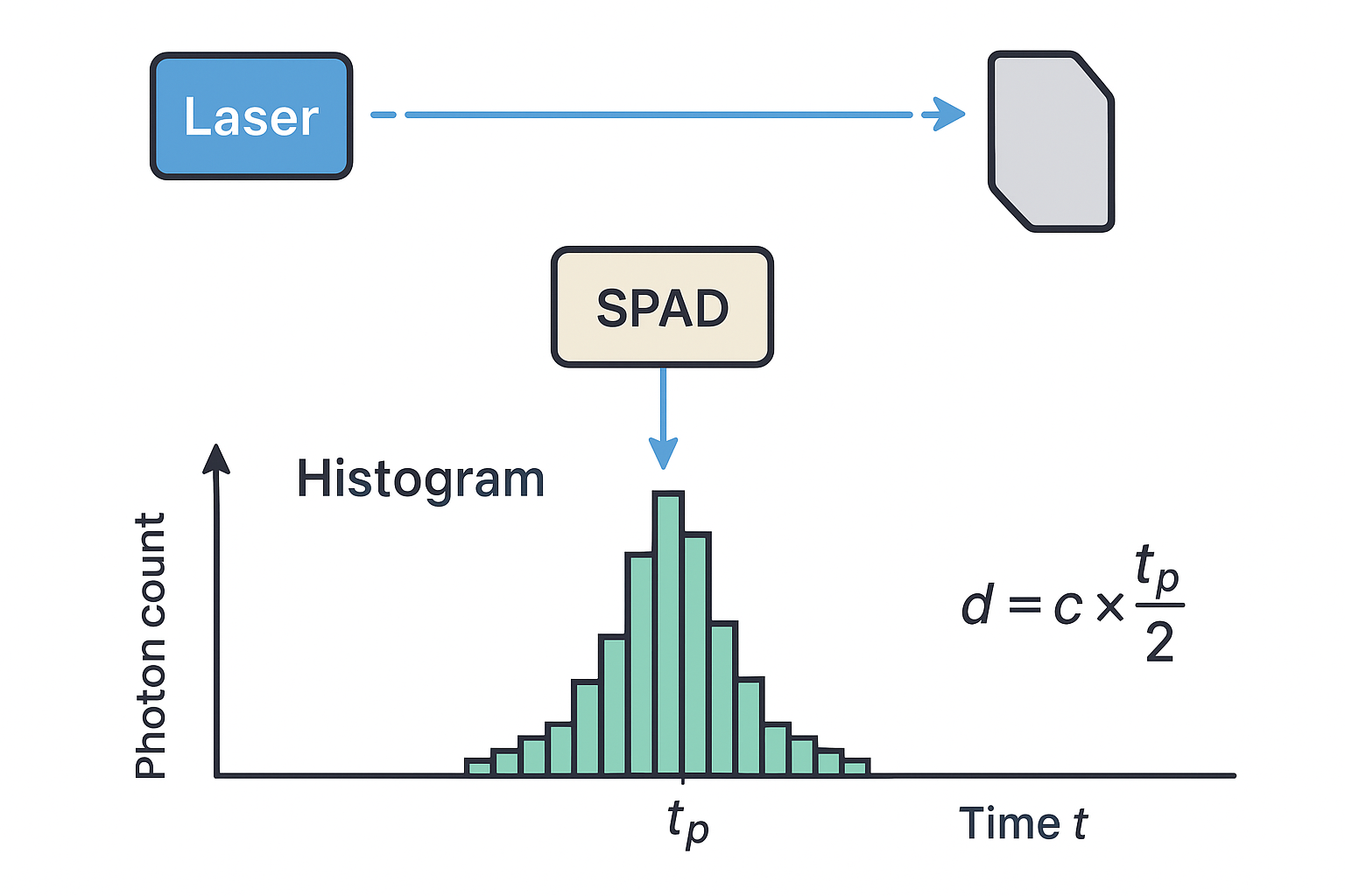 通过spad(Single Photon Avalanche Diode,单光子雪崩二极管)传感器,其很灵敏可以检测到单个光子到达事件。测距流程如下: