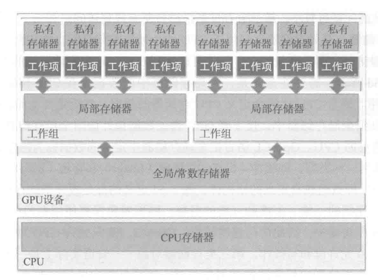 同时可以将工作项划分工作组,在工作组内的工作项可以访问组内共享的局部存储。后边会详细介绍为何会有工作组概念。
